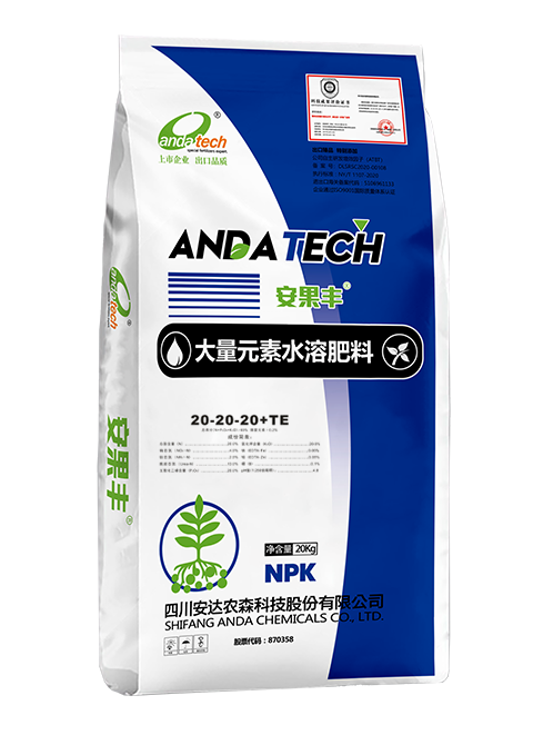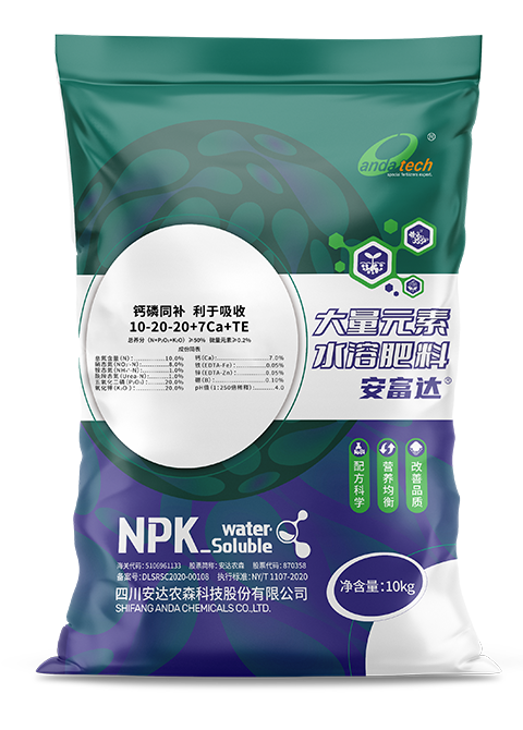 20-20-20+TE; 30-10-10+TE; 15-15-30+TE; 10-40-10+TE; 10-52-10+TE; 19-19-19+TE; 12-6-40+TE; 包装规格 20kg/袋 1、保水功能:本产品可减少作物根部水分流失,起保水功能,其次促进作物对氮磷钾的吸收; 2、水溶性好、肥效快:可大幅度提高肥料利用率,节约成本。特别适合在现代设施农业及园艺上滴灌、叶面喷施、冲施,是水肥一体化及无公害食品生产的理想选择。