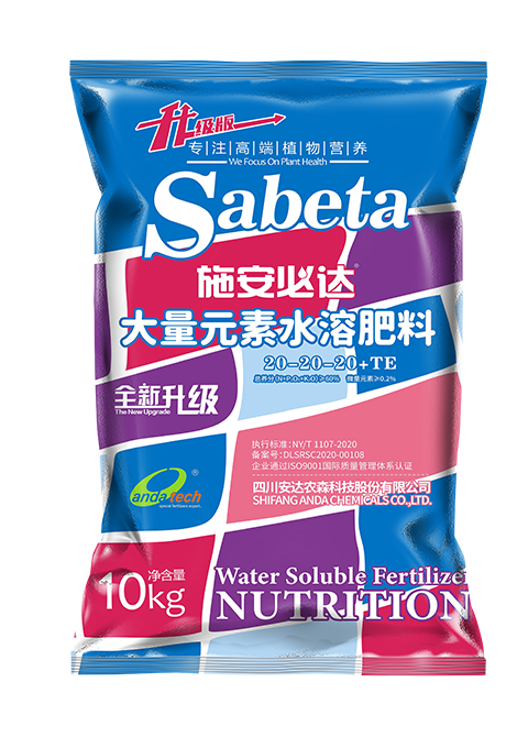 20-20-20+TE; 12-6-42+TE; 30-10-10+TE; 15-15-30+TE; 10-40-10+TE; 10-52-10+TE; 包装规格 10kg/袋 升级版施安必达是安达农森全新研制的一款升级产品,配方更科学,营养更全面,安全高效,新配方添加促根促生因子,更利于叶绿素的形成,促花保果提高作物产量。