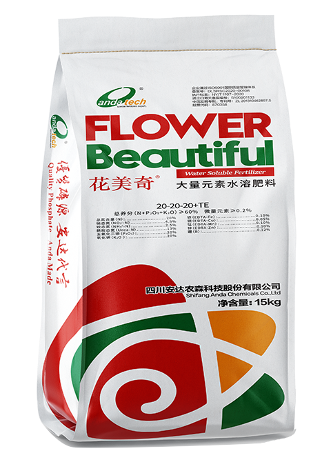 20-20-20+TE; 30-10-10+TE; 15-15-30+TE; 10-40-10+TE; 10-52-10+TE; 19-19-19+TE; 12-6-40+TE; 包装规格 15kg/袋 1、本产品添加矿物因子、植物提取活性成分、小分子糖类等促生因子及转色因子; 2、本品能够满足设施栽培需求,同时,也适用于室外景观作物(花卉)、经济作物等; 3、该品杂质少,电导率低,可施用于各类植物幼苗及其他生长时期; 4、包含多种螯合微量元素,各元素均衡配比,有效避免植物缺素症发生,确保植物健康生长。