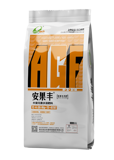 12-4-38+Mg+TE+ATBT 包装规格 20kg/袋 1、香蕉专用肥是针对香蕉的需肥特点,配置的专用配方; 2、释放土壤中固化元素:本品可增强土壤的通透性,改善作物的根系环境,释放土壤中固化的Ca,Zn,Fe等中、微量元素。 3、ATBT:特别添加安达农森自主研发的水溶肥增效因子,肥效更强劲; 4、富含硝态氮:全水溶、易吸收、增产增收; 5、膨果转色增甜:专用高钾配方增加糖度,提高光合作用积累产物,促进香蕉迅速膨大。添加亚磷酸二氢钾,能有效诱导作物持续产生对有害真菌、细菌的抗病能力,有效提高作物免疫力。