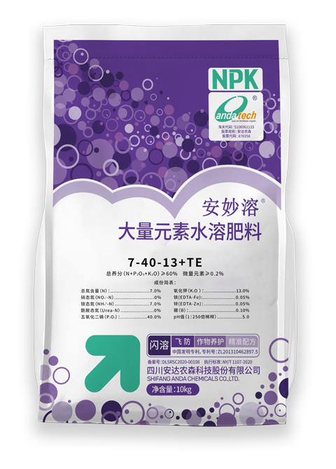 7-40-13+TE; 7-5-42+TE; 0-38-38+TE; 5-5-45+TE; 其他 包装规格 10kg/袋 1、采用独特的专利生产工艺(专利号:ZL202322591469.4),产品溶解速度快,吸收利用率高,见效快; 2、产品配方科学多样、针对性强,能促进作物提苗、膨果、转色等; 3、产品特别添加增效因子ATBT(专利号:ZL201310462897.5),是公司自主研发的水溶肥添加剂,能促进作物对营养的吸收利用,提高作物品质。
