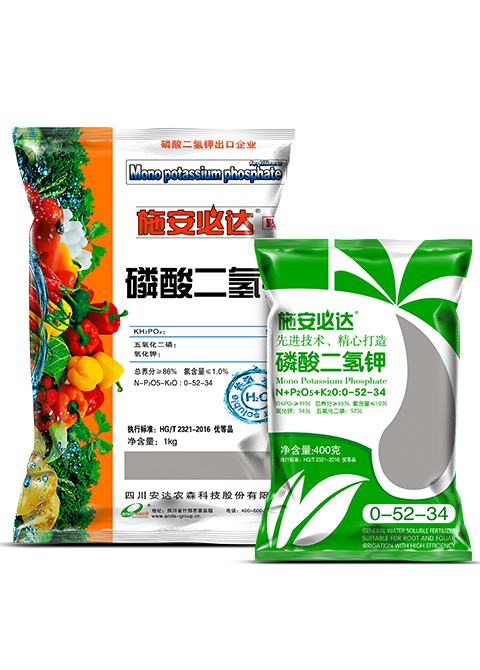 产品含量:0-52-34 技术指标:主含量≥99% pH:4.4-4.8 包装规格 400g/袋、1kg/袋 产品介绍:本品易溶于水、溶解快、具有纯度高、吸收好、使用安全等特点,能显提高作物的光合作用,促使茎秆粗壮,根系发达。有效促进花芽分化,催花促果,增加果品甜度。