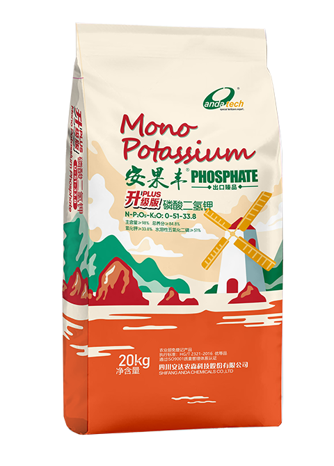 产品含量:0-51-33.8 技术指标:主含量≥98% 总养分≥84.8% 包装规格 20kg/袋 产品介绍:本品为升级版磷酸二氢钾,采用安达农森自研增效技术,添加多种天然生物活性物质,能提高磷酸二氢钾吸收效率,提高作物的抗逆性。