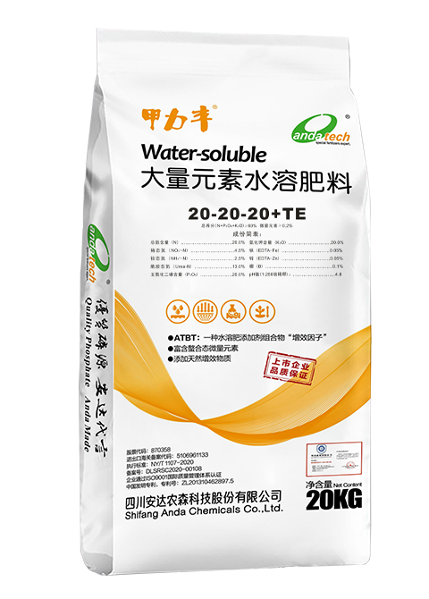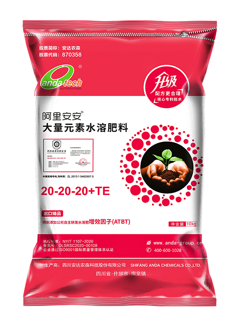 20-20-20+TE; 20-12-20+TE; 包装规格 20kg/袋 1、不同生育期搭配的增效因子(ATBT)不同,对刺激作物生长和营养的吸收达到最合理最大化的功效; 2、特别添加了有利于作物吸收的天然增效物质; 3、具有“保水”、“保肥”的功效; 4、本品采用出口级原料,结合行业领先生产工艺,快速水溶易吸收; 5、营养搭配科学,并富含多种微量元素。