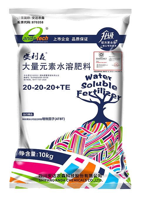20-20-20+TE; 30-10-10+TE; 15-15-30+TE; 10-40-10+TE; 10-52-10+TE; 19-19-19+TE; 12-6-40+TE; 包装规格 10kg/袋 1、保水功能:本产品可减少作物根部水分流失,起保水功能,其次促进作物对氮磷钾的吸收; 2、水溶快、肥效快:可大幅度提高肥料利用率,节约成本。特别适合在现代设施农业及园艺上滴灌、叶面喷施、冲施,是水肥一体化及无公害食品生产的理想选择。