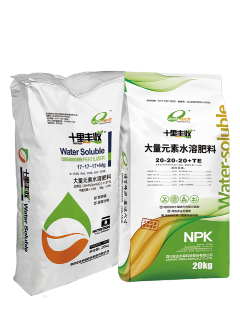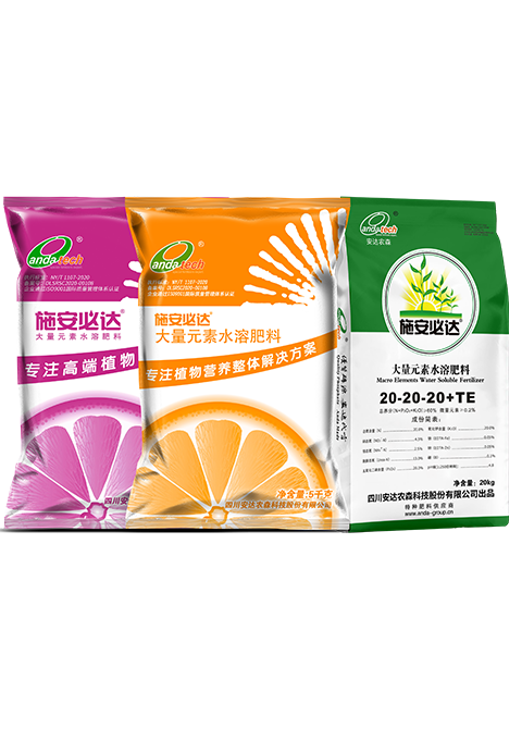 20-20-20+TE; 30-10-10+TE; 15-15-30+TE; 10-40-10+TE; 10-52-10+TE 19-19-19+TE 12-6-40+TE; 17-17-17+Mg; 10-5-35+Mg; 包装规格 20kg/袋 25kg/袋 1、本品采用优质原料,结合行业领先生产工艺,快速水溶; 2、吸收利用率高,大大减少由于土壤等原因造成的肥料浪费; 3、营养搭配科学、均衡,并含有中量元素,作用效果快,可以有效预防或治疗单一施肥引起的缺素症; 4、增强作物光合作用效率,提高作物产量和品质。