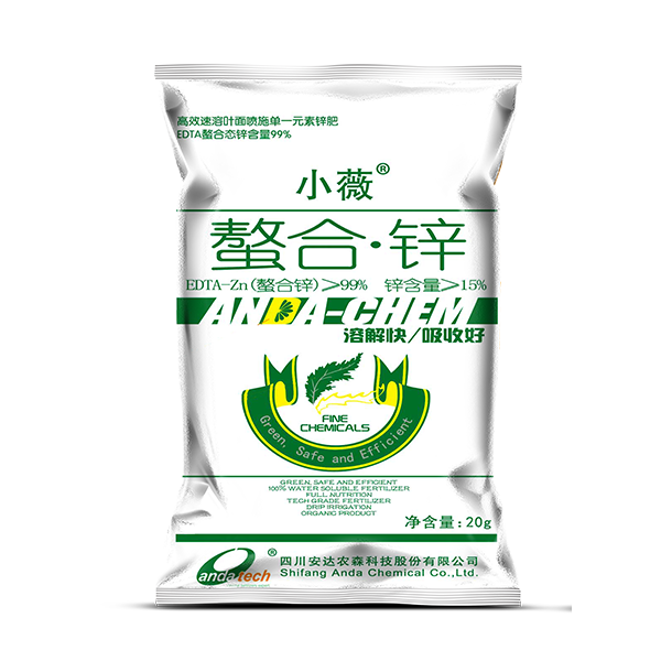 包装规格:20g*250袋/件产品介绍:1、促吸收:通过酶活性,引起体内叶绿素含量变化,促进光合作用,防治植物生长停滞,缓解缺锌引发的病毒症状,预防果树缺锌出现的新叶黄化;