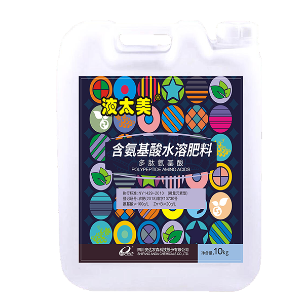 包装规格:10kg/桶产品介绍:1、出口级原料:选用出口级高纯度、高含量、全水溶原料,易被植物吸收;2、新技术:采用新一代生物技术,特别添加高活性氨基酸,螯合微量元素,积极促进作物生长发育;